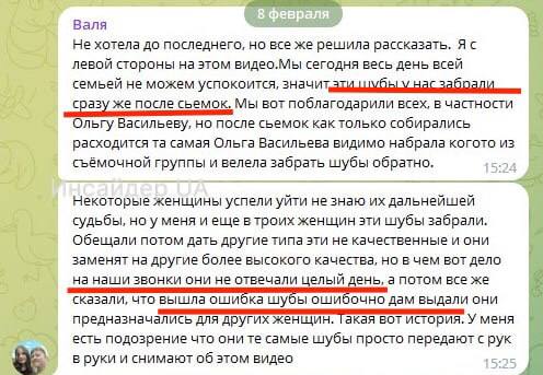 "Не хотіла до останнього, але все ж таки вирішила розповісти. Я з лівого боку на цьому відео. Ми сьогодні весь день всією родиною не можемо заспокоїтися, значить шуби у нас забрали відразу ж після знімання відео. Ми ось подякували всім, зокрема Ользі Васильєву, але після знімання щойно збиралися розходитись та сама Ольга Васильєва, мабуть, набрала когось зі знімальної групи й веліла забрати шуби назад", - пише жінка.