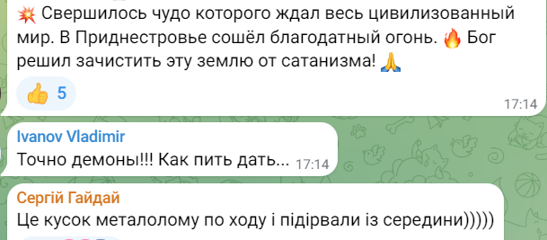 "Сьогодні на території однієї з військових частин Тирасполя сталася пожежа, яка виникла внаслідок вибуху. Попередньо встановлено, що вибух стався в результаті атаки дрона-камікадзе", - йдеться у повідомленні.