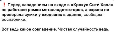 За даними Mash, очевидці повідомляють, що перед нападом на вході в "Крокус Сіті Холл" не працювали рамки металодетекторів, а охорона не перевіряла сумки біля входу до будівлі: