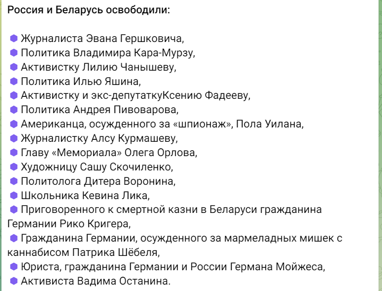 Крім того, в рамках угоди передбачається, що щонайменше 12 політичних ув'язнених із Росії будуть передані Німеччині. Росія ж отримає вісім осіб, більшість із яких підозрюються або засуджені через зв'язки з російською розвідкою.