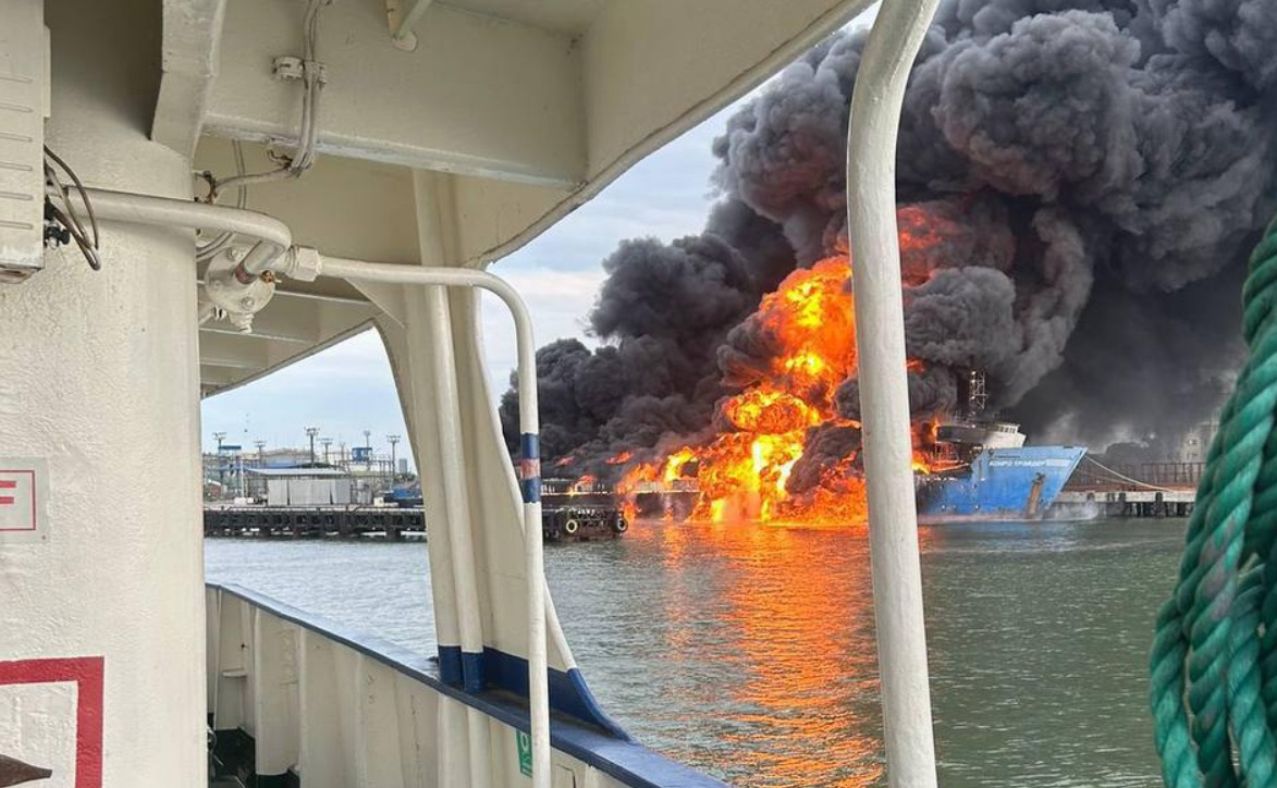 На кадрах, які з'явилися в мережі, видно, що після "прильоту" по судну цистерни з паливом спалахнули. У небо здіймався величезний стовп чорного диму з вогнем. Пожежі було присвоєно третій ранг. На місце прибули пожежний потяг, понад 30 одиниць техніки та понад 100 рятувальників.