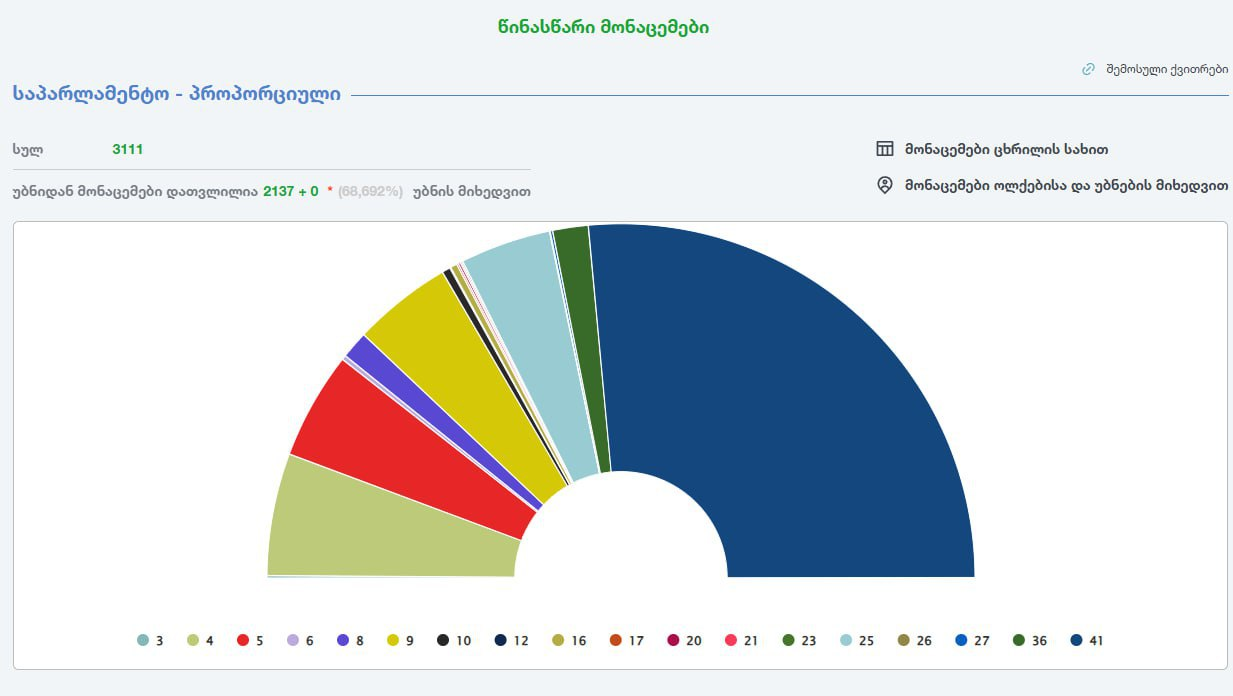 Центральна виборча комісія відзначає, що попередні результати відображені у графічному вигляді на офіційному сайті. Зокрема, синій колір на карті голосування позначає підтримку партії "Грузинська мрія", яка наразі домінує за кількістю набраних голосів.