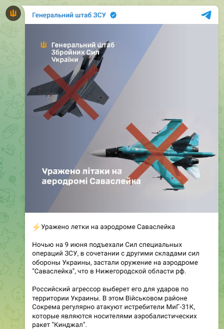 У ніч на 9 червня Сили спеціальних операцій ЗСУ, спільно з іншими підрозділами Сил оборони України, завдали точкового удару по летовищу "Саваслейка" - одному з ключових об'єктів російських ВКС, звідки регулярно злітають винищувачі МіГ-31К з ракетами "Кинджал".