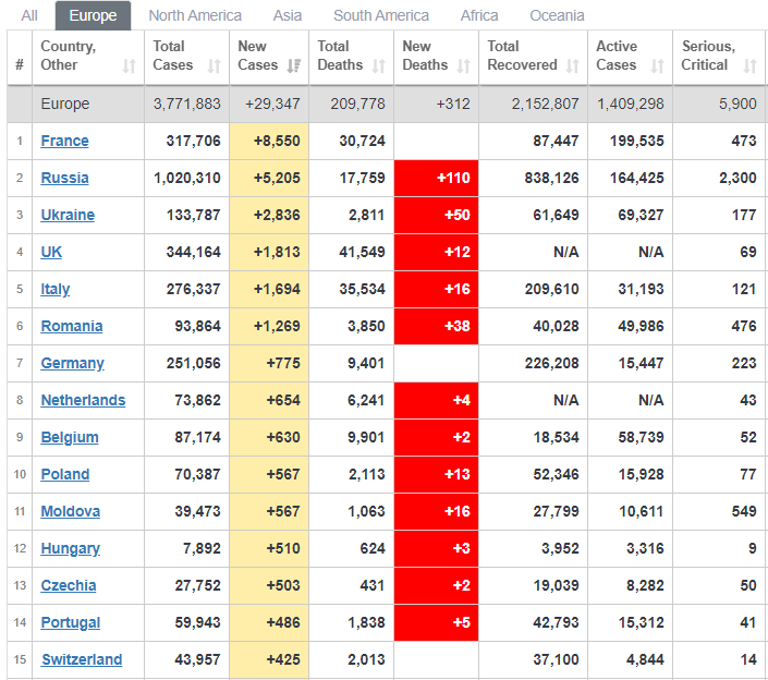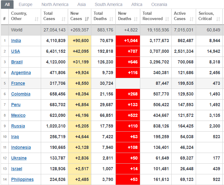 На першому місці за приростом нових хворих Індія (+90,600), далі йдуть США (+42,095), Бразилія (+31,199), Аргентина (+9,924), Франція (+8,550), Колумбія (+8,394), Перу (+6,854) , Мексика (+6,196), Росія (+5,205), Ірак (+4,644), Індонезія (+3,128).