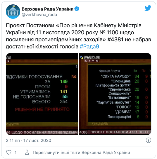 Таким чином, проєкт постанови № 4381 про скасування рішення Кабінету міністрів №1100 про посилення протиепідемічних заходів "провалився".