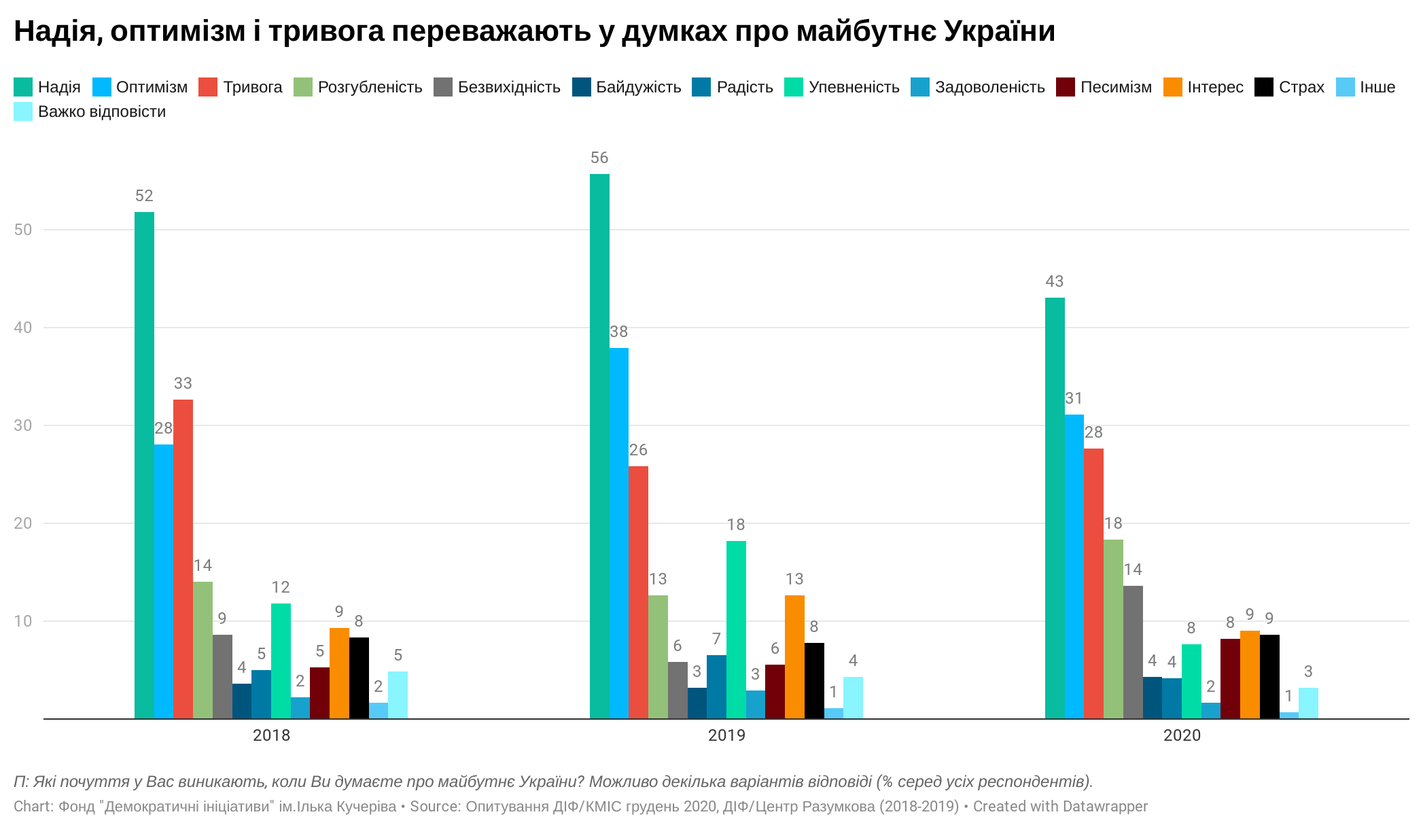 Наприкінці 2020 року, найпоширенішими почуттями, які відчувають українці розмірковуючи про майбутнє країни, лишилися надія (43%), оптимізм (31%) і тривога (28 %).