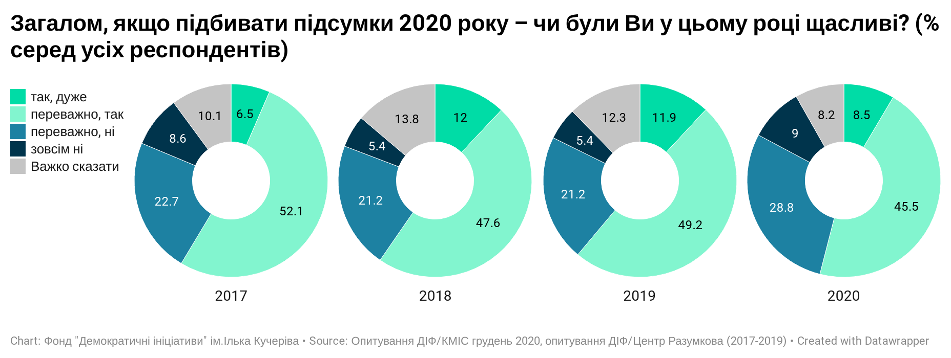 Попри економічні негаразди та епідемію коронавірусу більшість українців все ж почувалися щасливими у 2020 році: 8,5% дуже щасливими і 45,5% - переважно щасливими. Проте це найнижчий рівень відчуття щастя, порівняно з 2017-2019 роками.