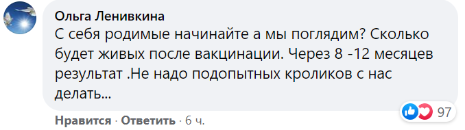 Користувачі мережі пишуть, що не хочуть бути "піддослідними кроликами", і закликають представників влади подати приклад і зробити щеплення спочатку собі.