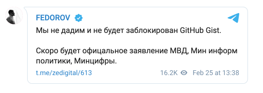 "Ми не дамо і не буде заблокований GitHub Gist", - написав Федоров.