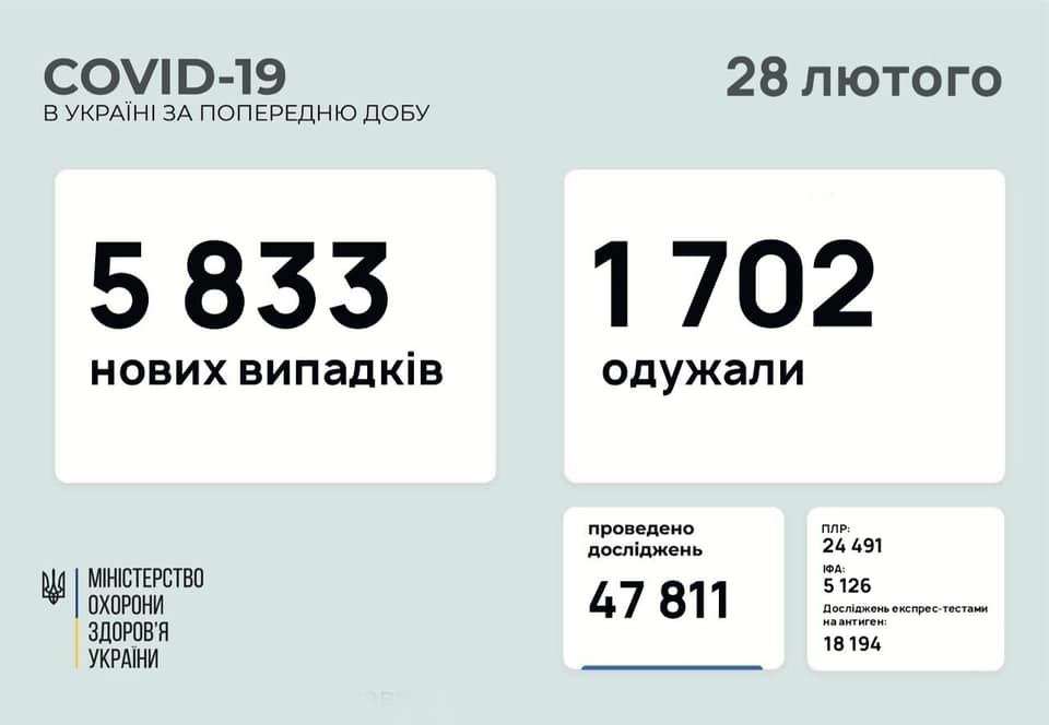 Станом на 28 лютого 2021 року в Україні зафіксовано 5 833 нових випадків коронавірусної хвороби COVID-19. Зокрема, захворіли 795 дітей та 146 медпрацівників.