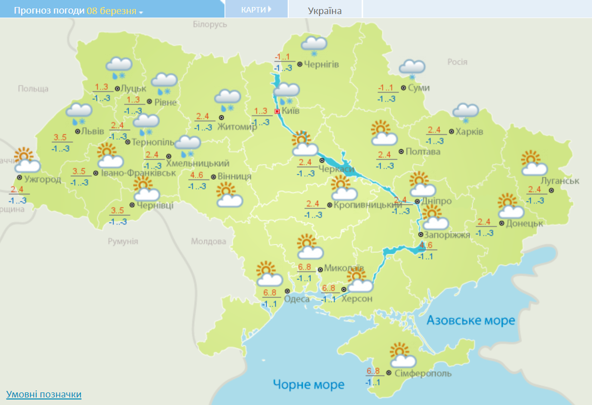 6-7 березня опади покинуть територію України, проте вночі температура опуститься до мінусової. У більшості областей вдень стовпчики термометрів не підніматимуться вище +4 градусів. Вночі похолодає до -4-6.