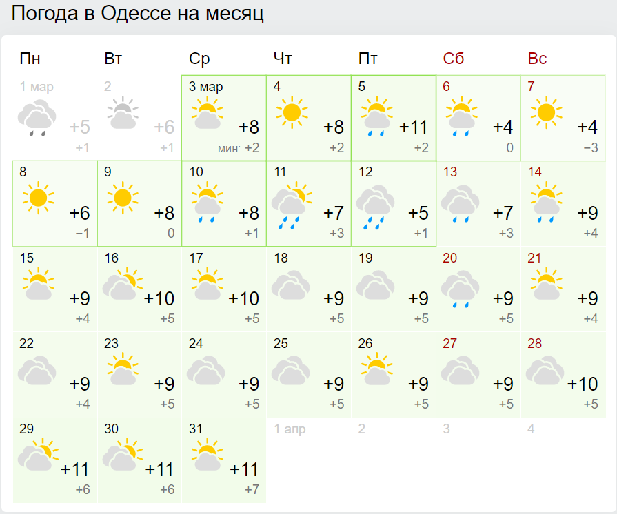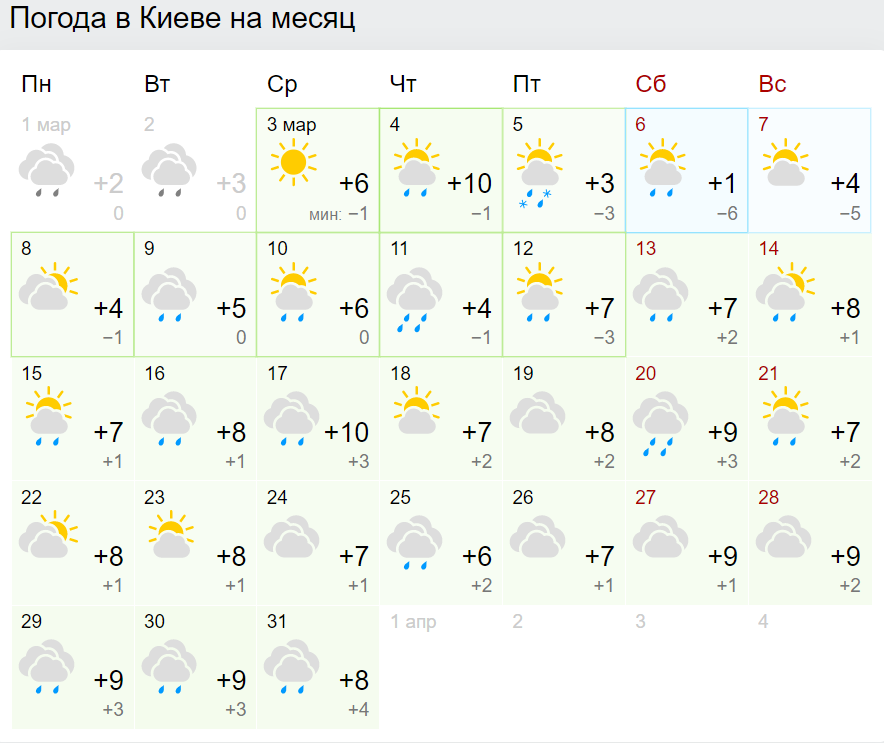 За прогнозами сайту Gismeteo.ua, температура в Києві навряд чи підніметься вище +10 градусів до кінця березня. Втім, особливого тепла не буде навіть на півдні: в Одесі очікується +11 градусів тільки в останніх числах місяця.