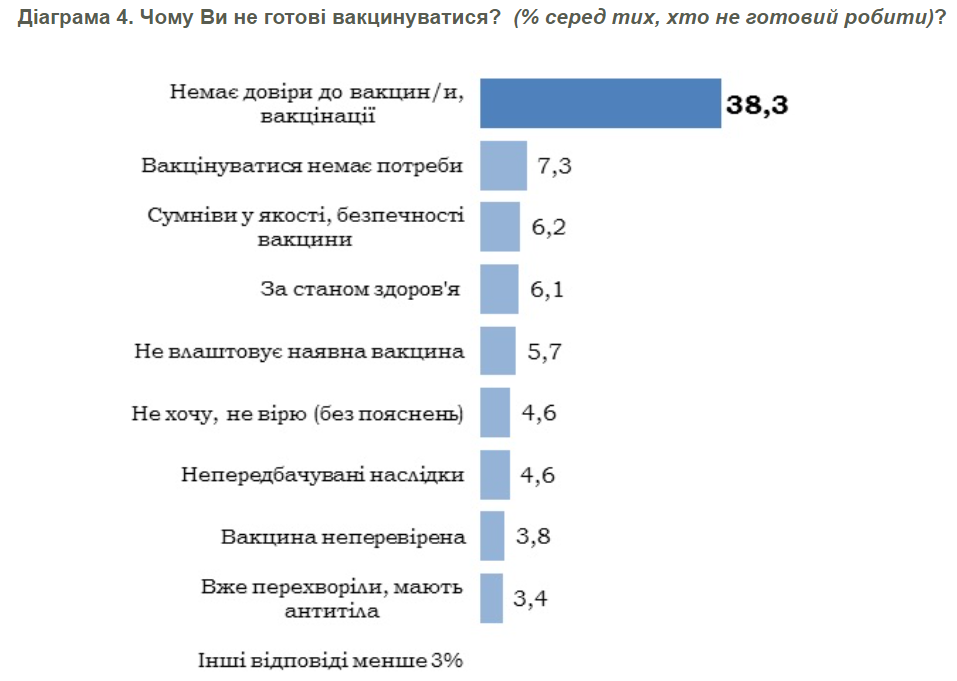 Основна причина небажання українців вакцинуватися - недовіра до вакцини. Саме таку причину назвали 38% тих, хто не готовий робити щеплення. Ще 6% мають сумніви щодо якості та безпечності вакцини, 4% заявили, що вакцина неперевірена. 6% респондентів зазначили, що їх не влаштовує наявна вакцина, без пояснень чому. Якщо підсумувати усі ці відповіді, то виявляється, що сумніви у вакцині мають 54% тих, хто не готовий вакцинуватися.