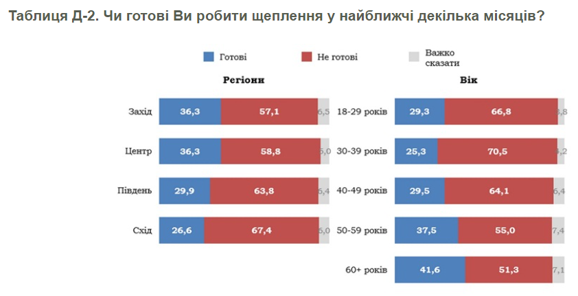 Відсоток тих, хто не готовий вакцинуватися від COVID-19 у найближчі місяці, найвищий на сході України - 67%, найнижчий на заході - 57%.