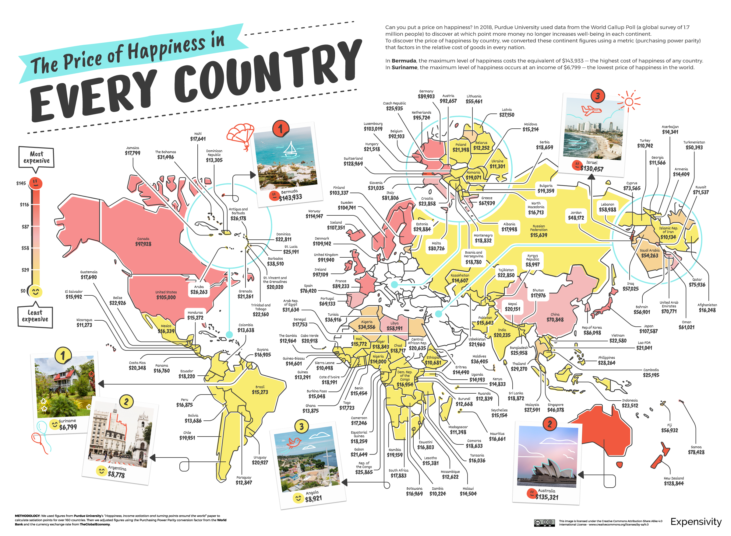 На карті можна побачити, що, наприклад, в Австралії щастя "має ціну" понад 135 тисяч доларів, у США та Канаді від 97 тисяч доларів "з копійками" до 105 тисяч доларів.