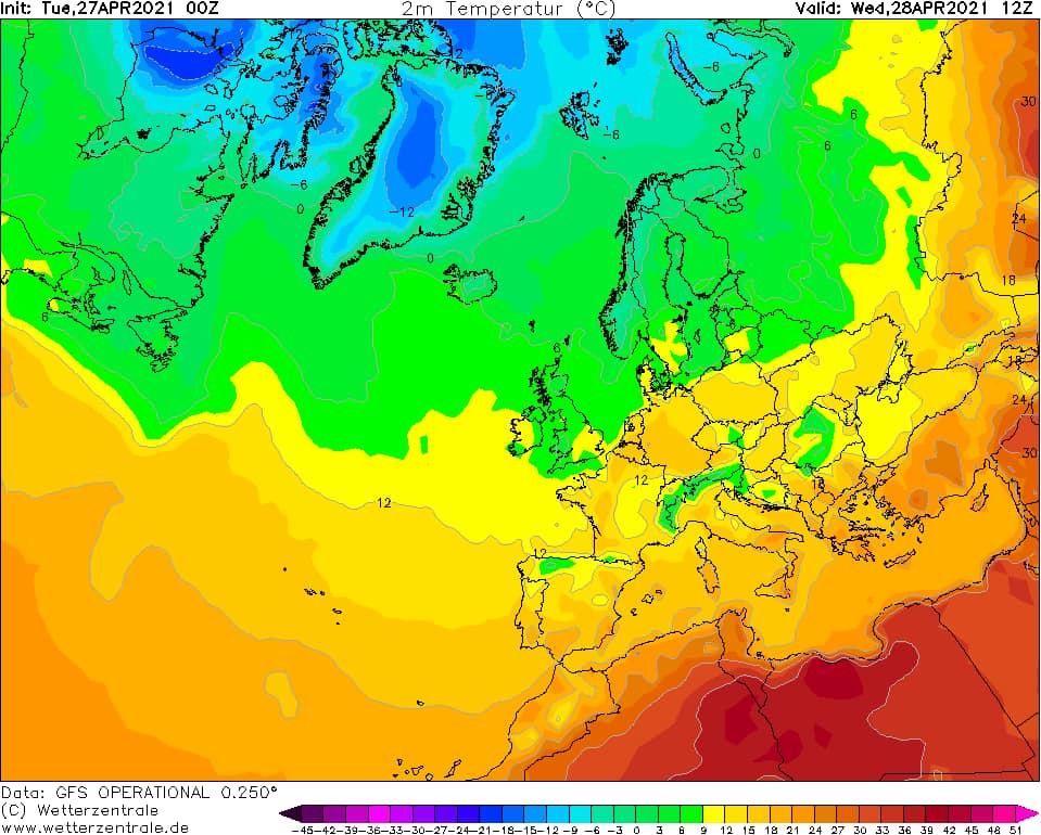 За інформацією УкрГідрометцентру, вночі 28 квітня сильні заморозки у повітрі 0-5° (II рівень небезпечності, помаранчевий), у південно-східній частині заморозки на поверхні ґрунту 0-5° (I рівень небезпечності, жовтий).