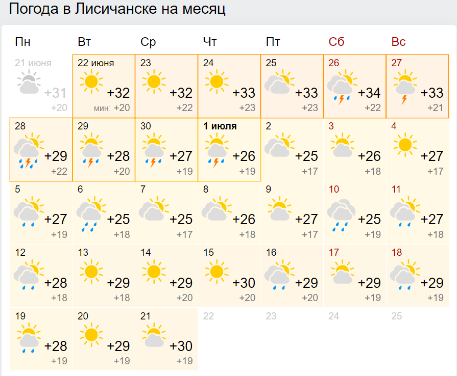 Так, на 23 червня місцеві синоптики прогнозують по Луганській області мінливу хмарність, відсутність опадів, гарну видимість. Вітер східний, 7-12 м/с. Температура вночі +17 +22, вдень +32 +37. По місту Сєвєродонецьк - мінлива хмарність, без опадів. Вітер східний 7-12 м/с. Температура вночі +20 +22, вдень +35 +37 градусів.