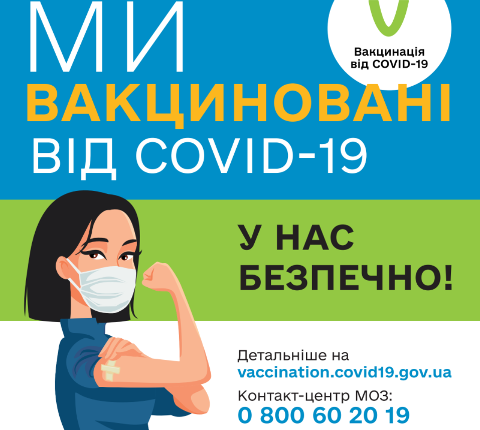 Пропонуються кілька варіантів стікерів з текстом "Ми вакциновані від COVID-19", "Давай і ти", "У нас безпечно" і подібні.
