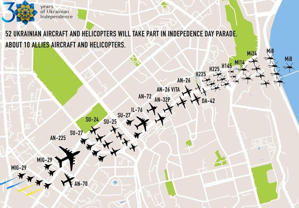 На завершення параду бойові літаки повинні випустити сигнальні ракети з димом кольорів українського прапора.