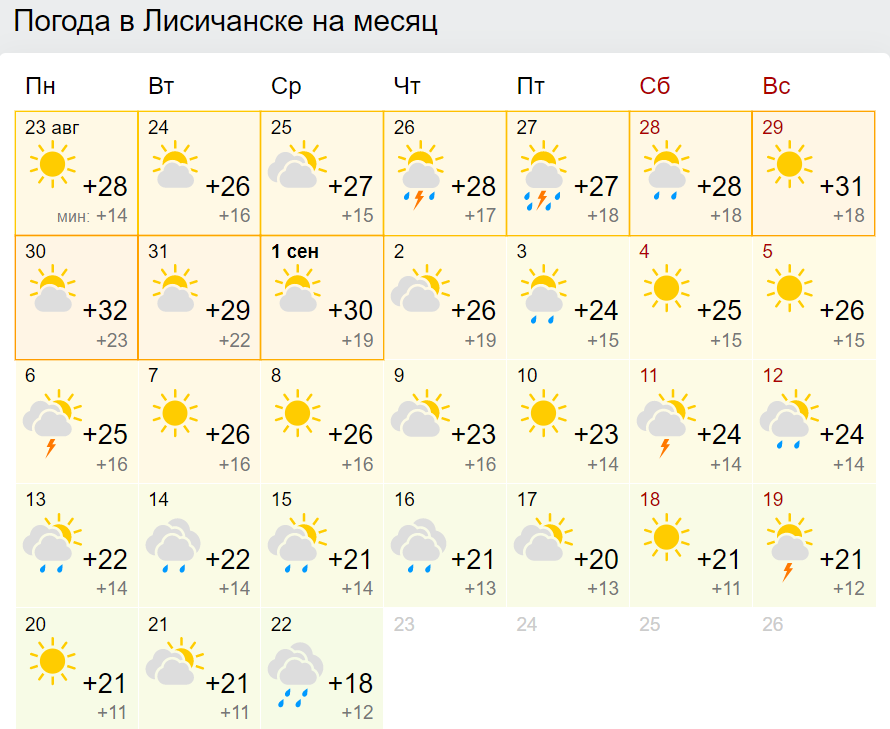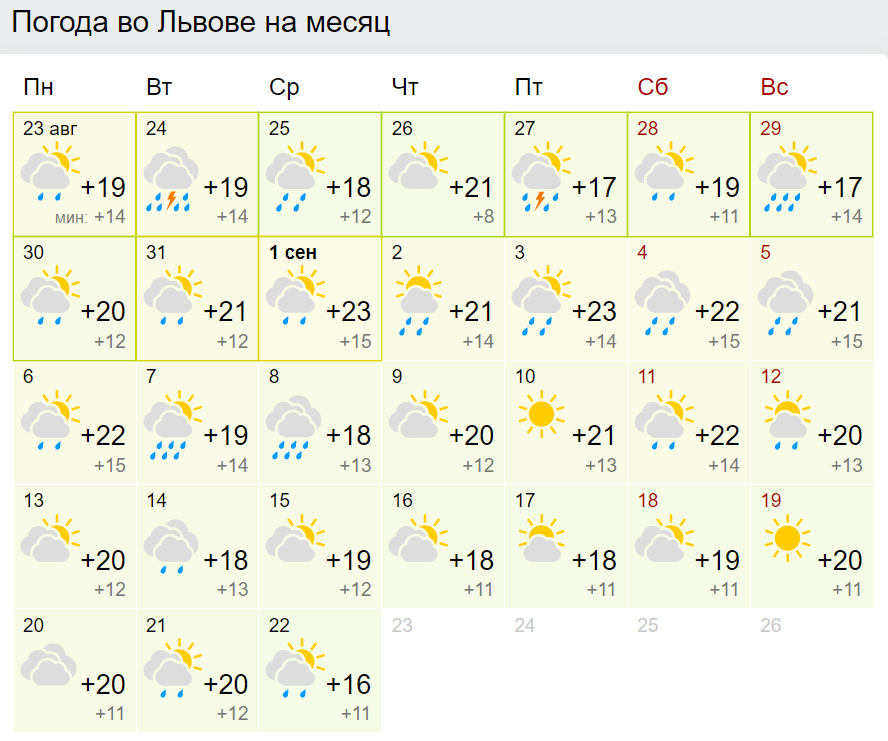 Що стосується довгострокової погодної перспективи, то, за попередніми прогнозами, у вересні в Україні буде плавно наступати осінь. За даними сайту gismeteo.ua, спеки в Києві більше не передбачається, в останні дні літа імовірна температура +27 +28, а потім вона буде поступово опускатися.