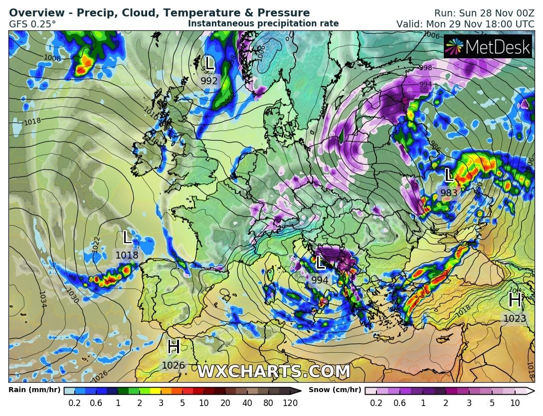 У понеділок активний циклон Benedikt організує складну погоду в більшості областей України, очікуються сніг та грози.