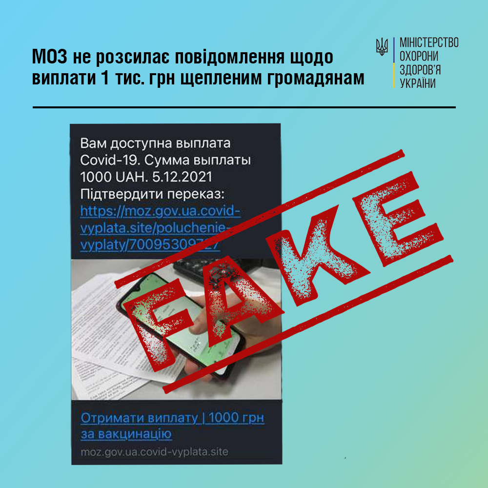 У прес-службі МОЗ зазначили, що у мережі поширюються неправдиві повідомлення нібито від імені Міністерства охорони здоров’я, в яких пропонують користувачам надати контактні дані для виплати 1 тис. грн особам, які завершили повний курс щеплення від COVID-19.