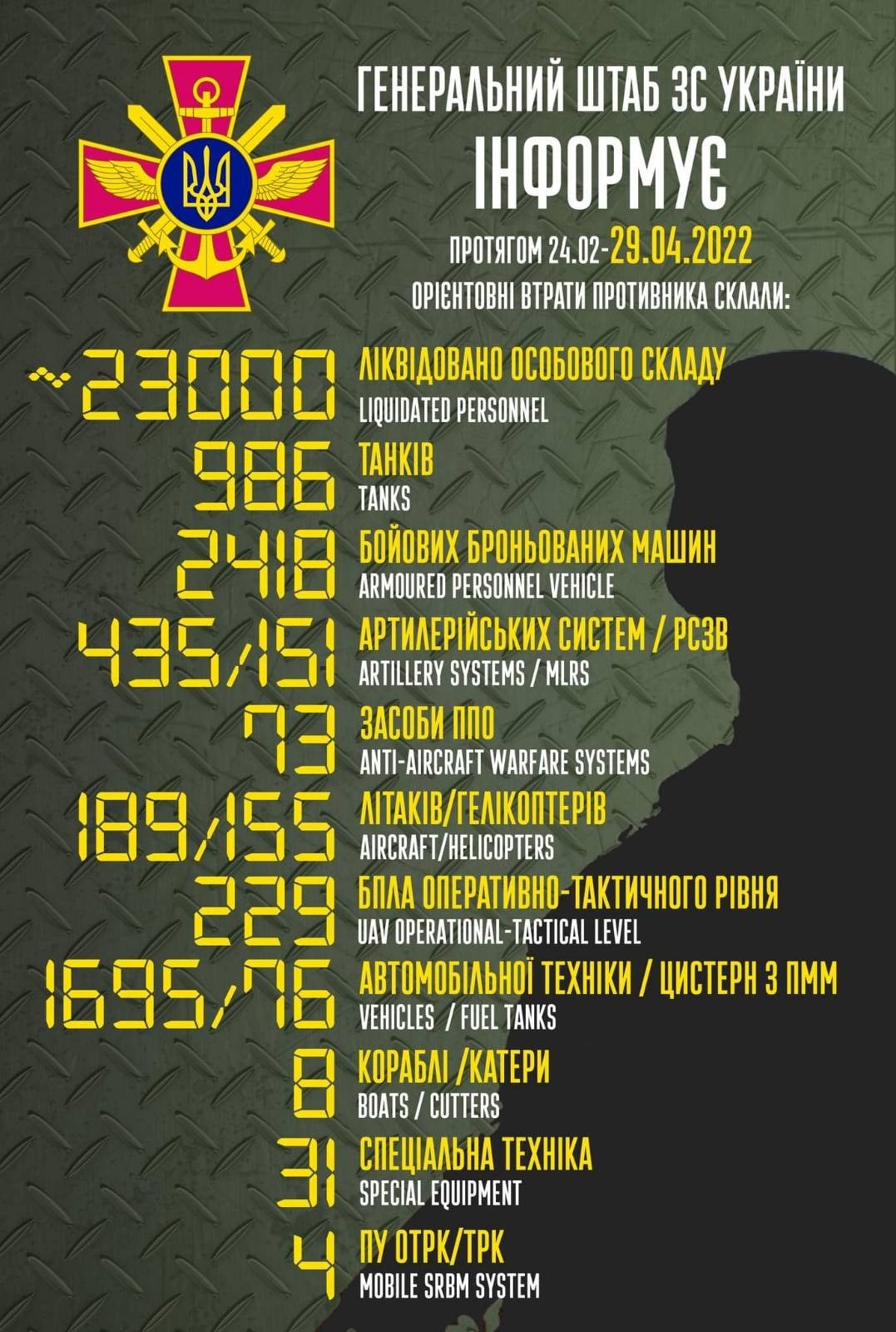 Загальні бойові втрати противника з 24.02 по 29.04 орієнтовно склали: