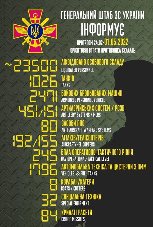 Загальні бойові втрати противника з 24.02 до 01.05 орієнтовно склали: