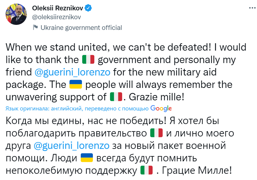 "Коли ми єдині, нас не перемогти! Я хотів би подякувати уряду Італії та особисто моєму другу Лоренцо Геріні за новий пакет військової допомоги. Народ України завжди пам'ятатиме непохитну підтримку Італії. Grazie mille (Велике дякую - ред.)!" - написав Резніков.