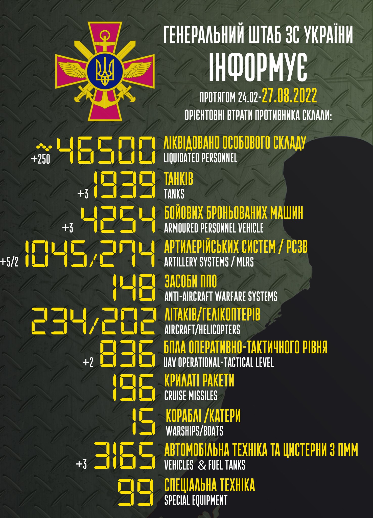 Загальні бойові втрати противника з 24.02 по 27.08 орієнтовно склали: