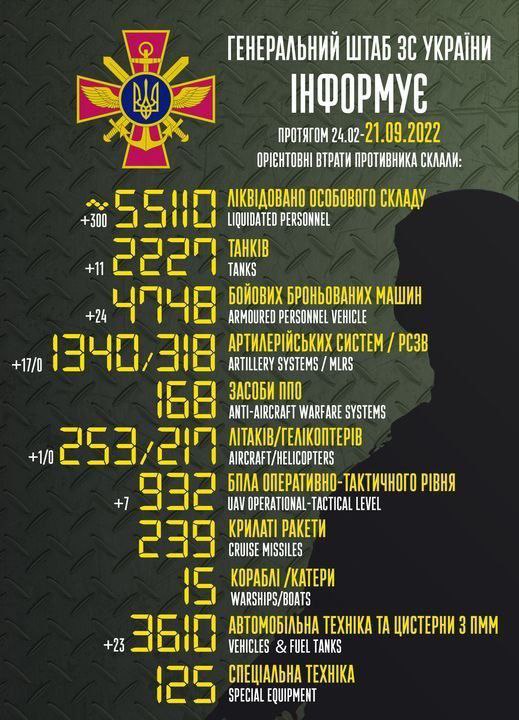 Загальні бойові втрати противника з 24.02 до 21.09 орієнтовно склали: