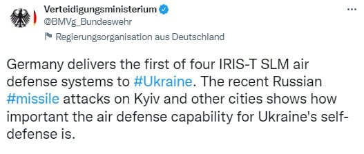 "Нещодавні ракетні удари Росії по Києву та іншим містам показують, наскільки важливим є потенціал протиповітряної оборони для самооборони України", - заявили в Міноборони ФРН.
