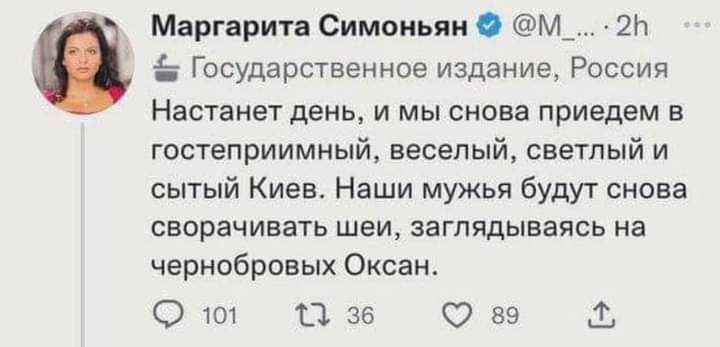 Секретар РНБО Олексій Данілов відреагував на повідомлення російської пропагандистки Маргарити Симоньян, в якому вона сказала, що "російські чоловіки знову згортатимуть шиї, заглядаючи на чорнобрових Оксан" у Києві.