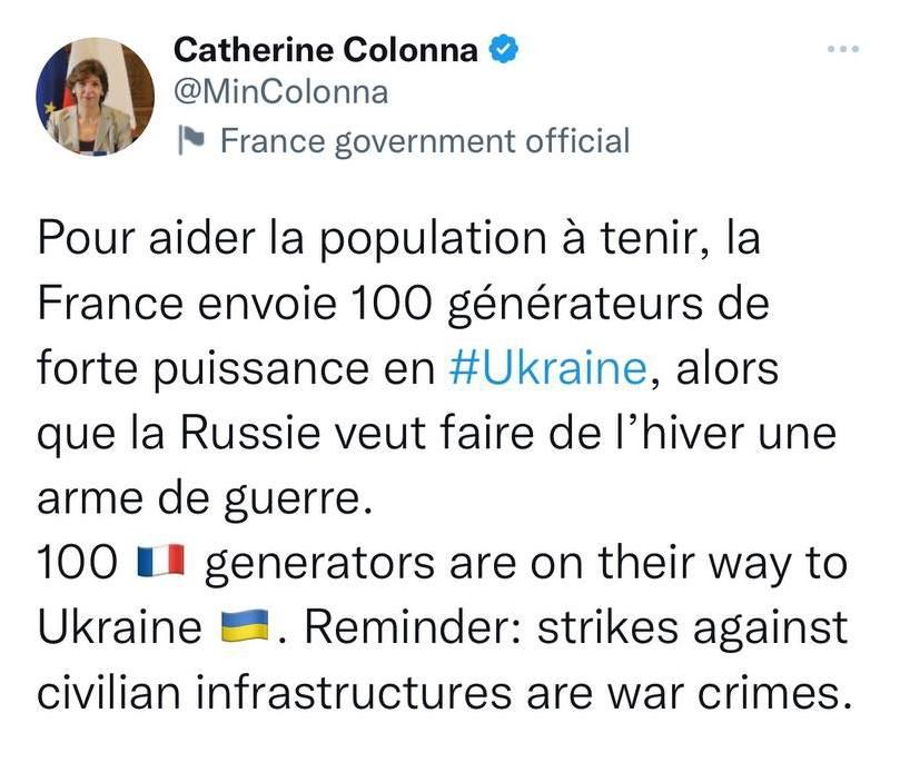 "Щоб допомогти населенню вистояти, Франція надсилає 100 потужних генераторів Україні. Нагадуємо: удари по цивільній інфраструктурі є військовими злочинами", - зазначила Колонна у Twitter.