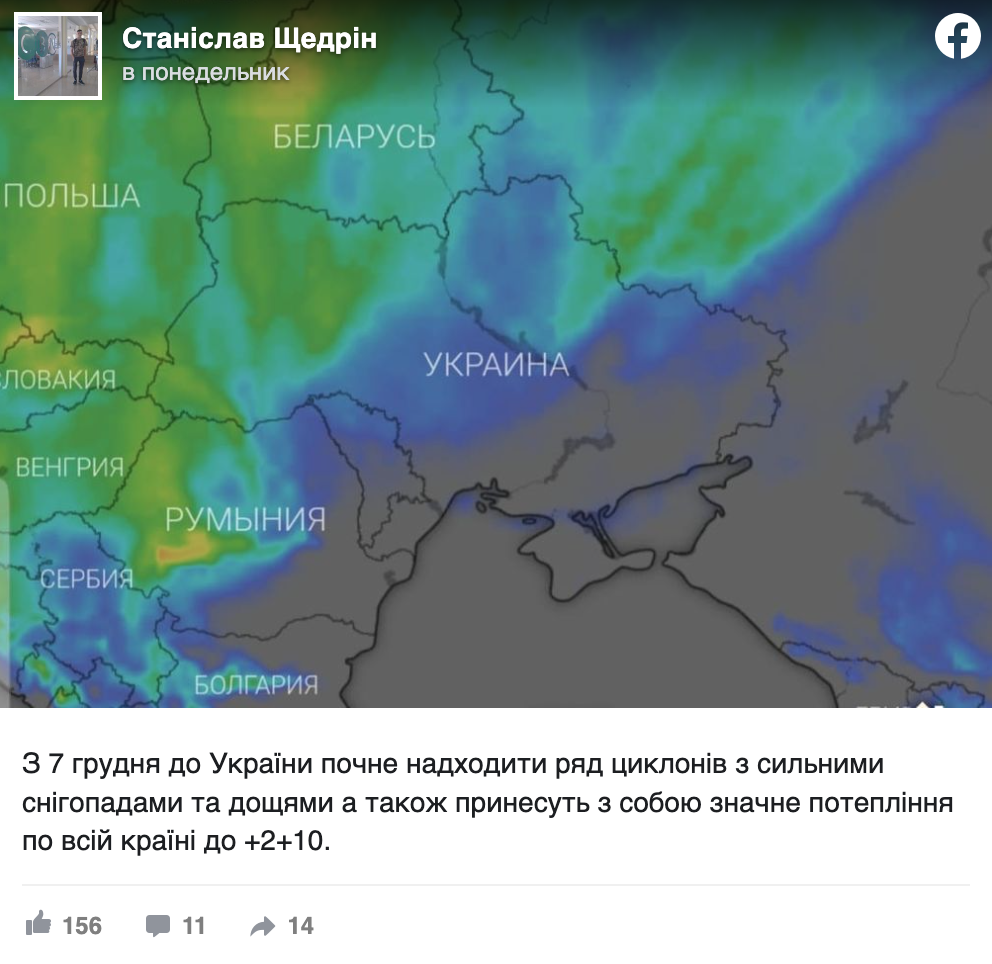 Такий прогноз оприлюднив український народний синоптик Станіслав Щедрін у Facebook, передає Час Пік.