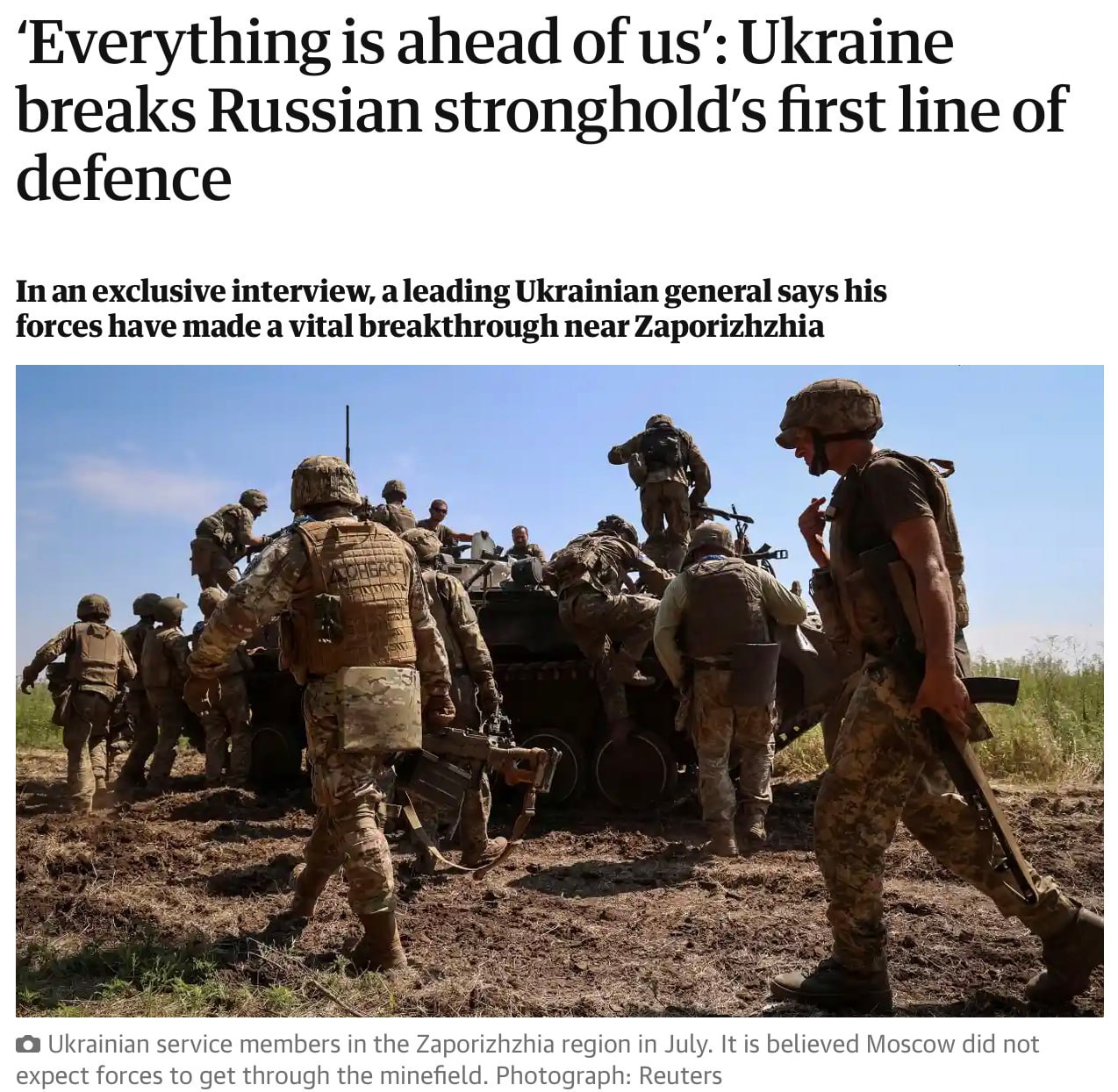 ЗСУ прорвали першу лінію оборони росіян на південному фронті. Наразі українські війська розширюють фронт прориву в обидві сторони.