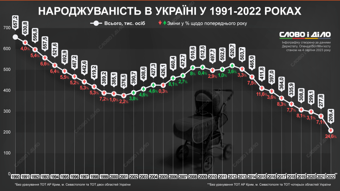 З інфографіки видання "Слово і Діло" відомо, що у 2023 році Україна встановила новий антирекорд з народжуваності. 187 тисяч малят за рік — це найнижчий показник за часи незалежності України.