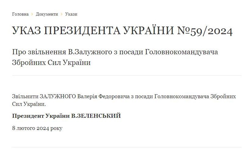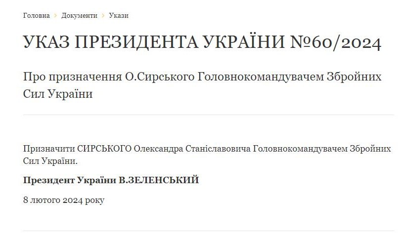 На сайті Офісу президента опублікували офіційні укази про звільнення Залужного та призначення Сирського на посаду Головнокомандувача ЗСУ: