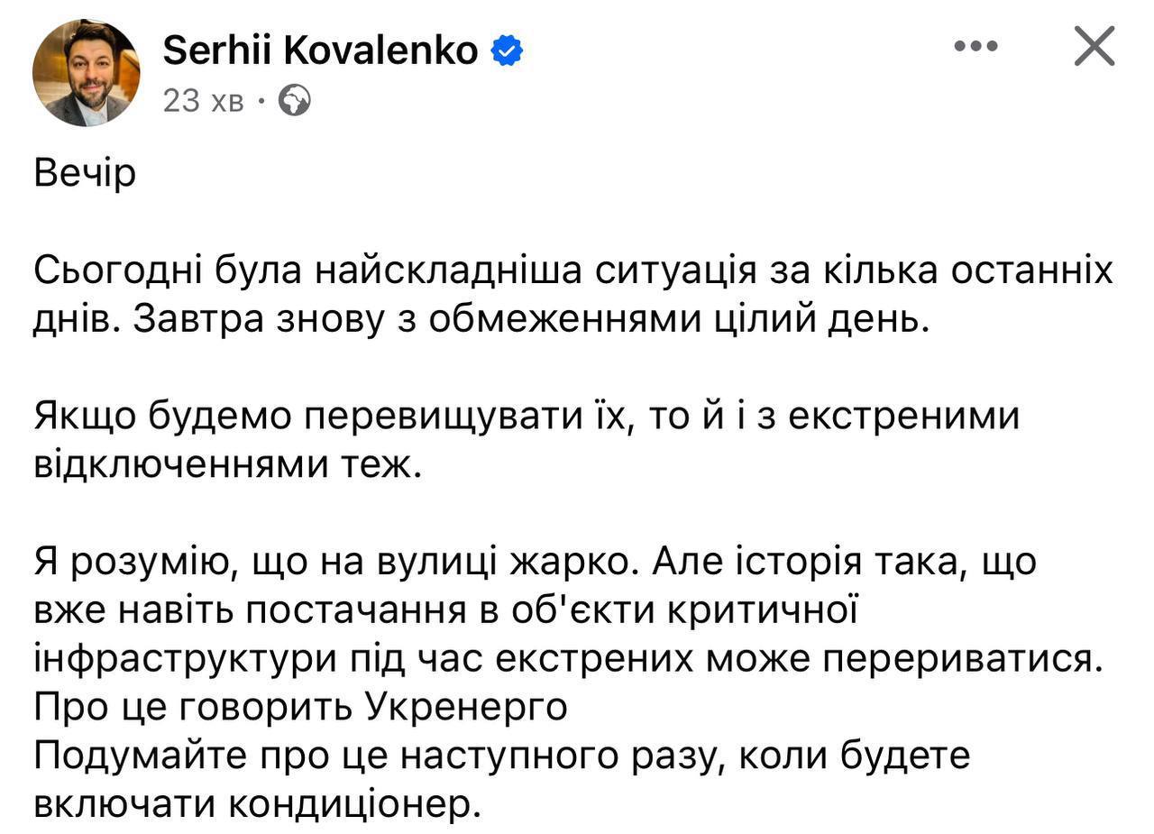 "Я розумію, що на вулиці жарко. Але історія така, що вже навіть постачання в об'єкти критичної інфраструктури під час екстрених може перериватися. Про це говорить Укренерго. Подумайте про це наступного разу, коли будете включати кондиціонер", - наголосив він.
