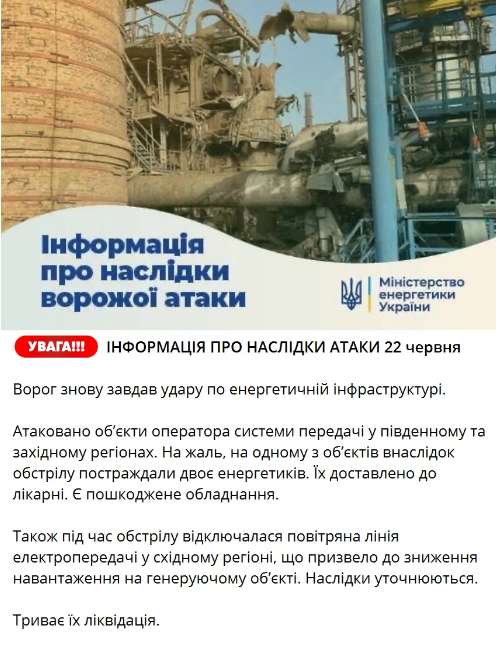 У ніч проти 22 червня російські окупанти здійснили масштабну атаку на об’єкти енергетичної інфраструктури України в південних та західних регіонах країни. Ця атака призвела до значних пошкоджень, а також постраждали працівники енергетичних об’єктів.