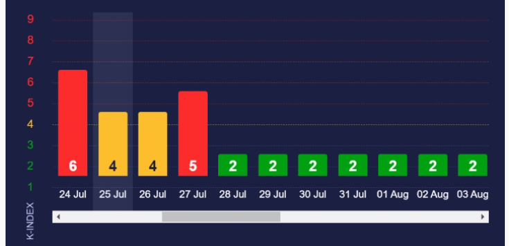 Сьогодні, 27 липня, Україну очікує потужна магнітна буря червоного рівня. Це явище пов’язане зі спалахом на Сонці, що відбувся раніше. Вчені прогнозують, що буря досягне К-індексу 5, що відповідає червоному рівню магнітної активності.