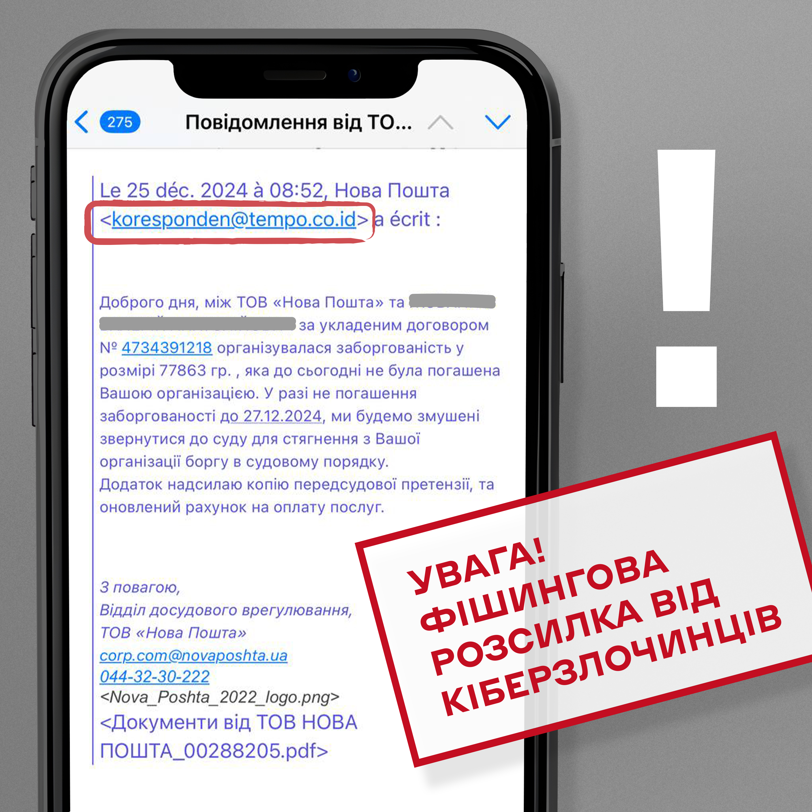 Варто наголосити, що зловмисники використовують ім’я відомого бренду для того, щоб створити ілюзію легітимності своїх листів. У повідомленнях йдеться про нібито борг перед Новою поштою, а також містяться вкладення, які можуть містити шкідливе програмне забезпечення. Ці листи виглядають досить переконливо, однак вони не мають жодного зв’язку з реальною компанією.