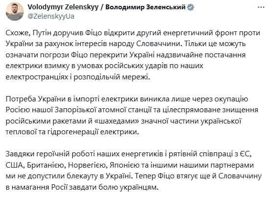На його думку, "схоже, що Путін доручив Фіцо відкрити другий енергетичний фронт проти України". Президент зазначив, що це рішення йде врозріз з інтересами народу Словаччини та підриває європейські принципи енергетичної безпеки.