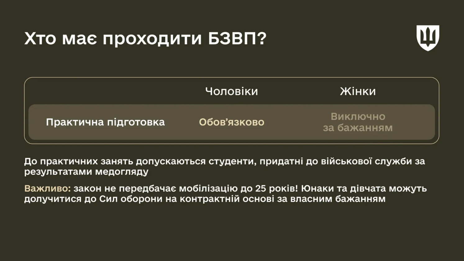 Студенти чоловічої статі, які відмовляться від проходження базової загальновійськової підготовки, можуть бути відраховані. Для чоловіків і теоретичний, і практичний курс БЗВП є обов'язковим.