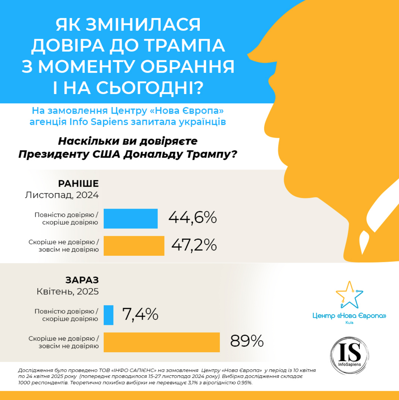 Опитування на 100 днів президентства Трампа виявило повну втрату довіри українців. У середині квітня 2025 року йому довіряли 7,4% респондентів, не довіряли - 89% опитаних.