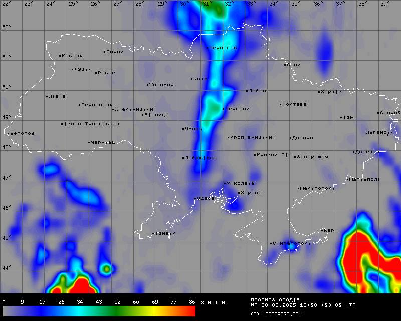 Найбільш дощовою 30 травня буде смуга, що проходить через окремі райони, де можливі грози, а місцями — навіть град. Атмосферні фронти сприятимуть виникненню локальних злив, які можуть бути короткочасними, але інтенсивними.