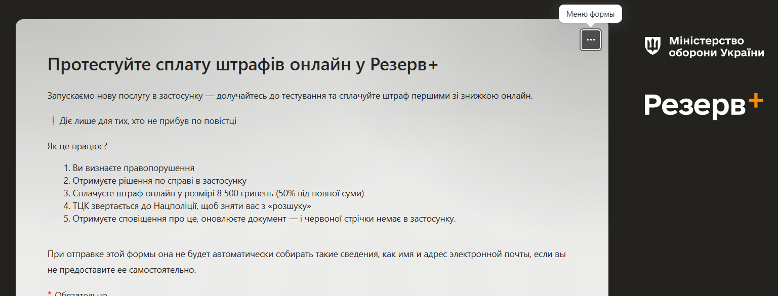 Міністерство оборони України запустило бета-тест нової функції у додатку "Резерв+", що дозволяє військовозобов'язаним сплатити штраф за неявку на порядку денному онлайн - без візиту до ТЦК та зі знижкою в 50%.