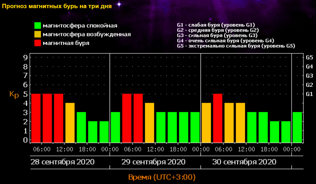 Магнітна буря рівня G1 триває і зараз. Згідно з прогнозом, ще два дні, 29 і 30 вересня, будуть відбуватися значні магнітні коливання вранці, а до вечора вони будуть вщухати.