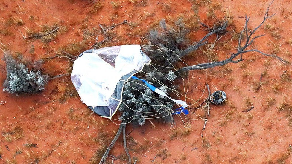 Контейнер зі зразками з астероїда Рюгу спустився на парашуті і приземлився на полігоні в районі міста Вумера ввечері в суботу (за Гринвічем). Команда австралійських рятувальників знайшла капсулу на піщаному грунті, парашут був накинутий на дерево.