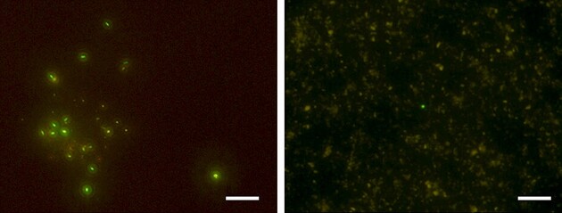 Флуоресцентна мікрофотографія клітин із зразків: зліва - з глибини 652 метрів (температура 76 градусів Цельсія), праворуч - 1177 метрів (120 градусів Цельсія).